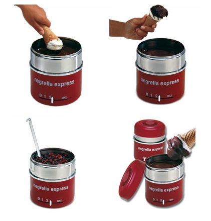 Λιώνει και κρατά την σοκολάτα σε ρευστή μορφή και σε σταθερή θερμοκρασία, επιτρέποντάς της να λάβει το παγωτό μας και να το επικαλύψει με ευκολία. Ιδανικό ακόμα για (πραλίνες, διάφορες σάλτσες και φρούτα).